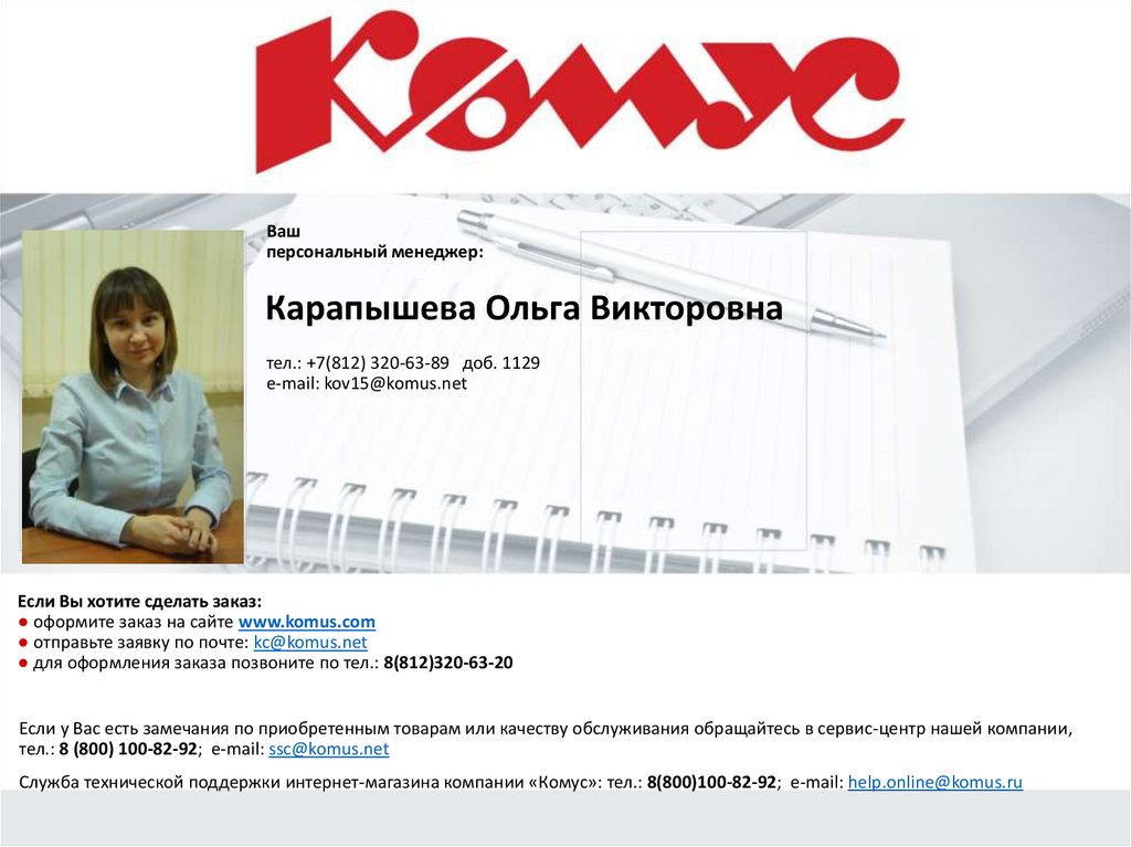 Служба технической поддержки интернет-магазина компании «Комус»: тел.: 8(800)100-82-92; e-mail: help.online@komus.ru