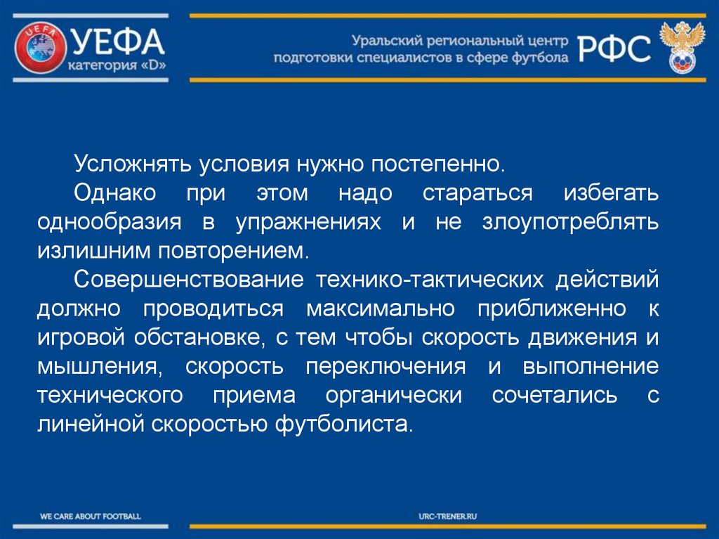 Усложнять условия нужно постепенно.Однако при этом надо стараться избегать