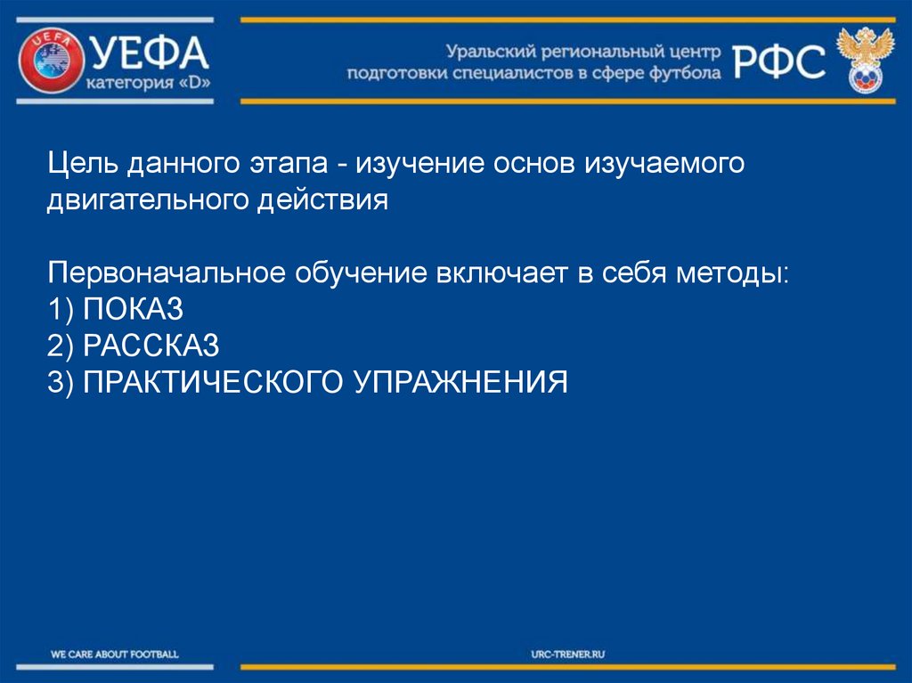 Цель данного этапа - изучение основ изучаемогодвигательного действия
