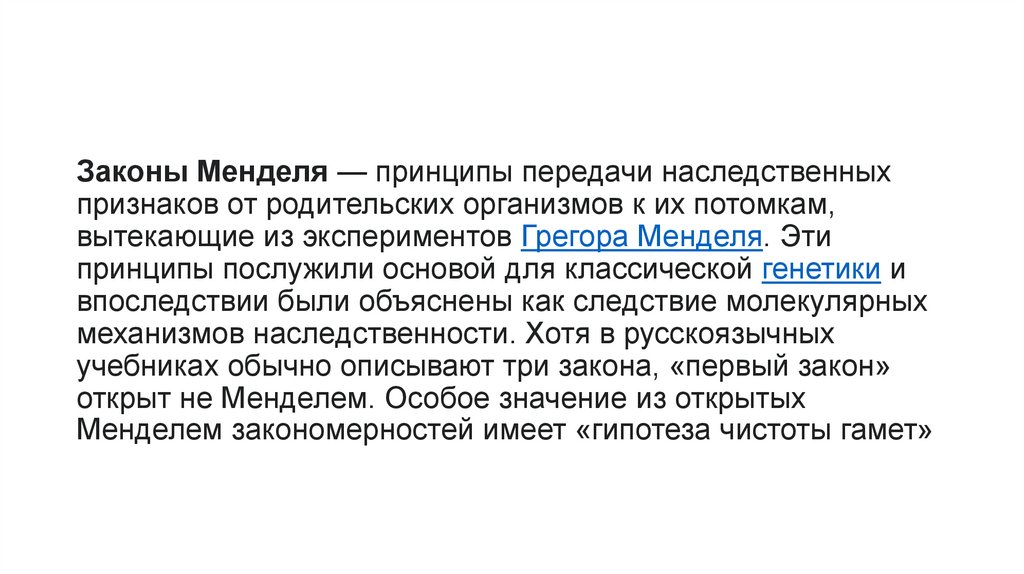 Законы Менделя — принципы передачи наследственныхпризнаков от родительских организмов к их потомкам,
