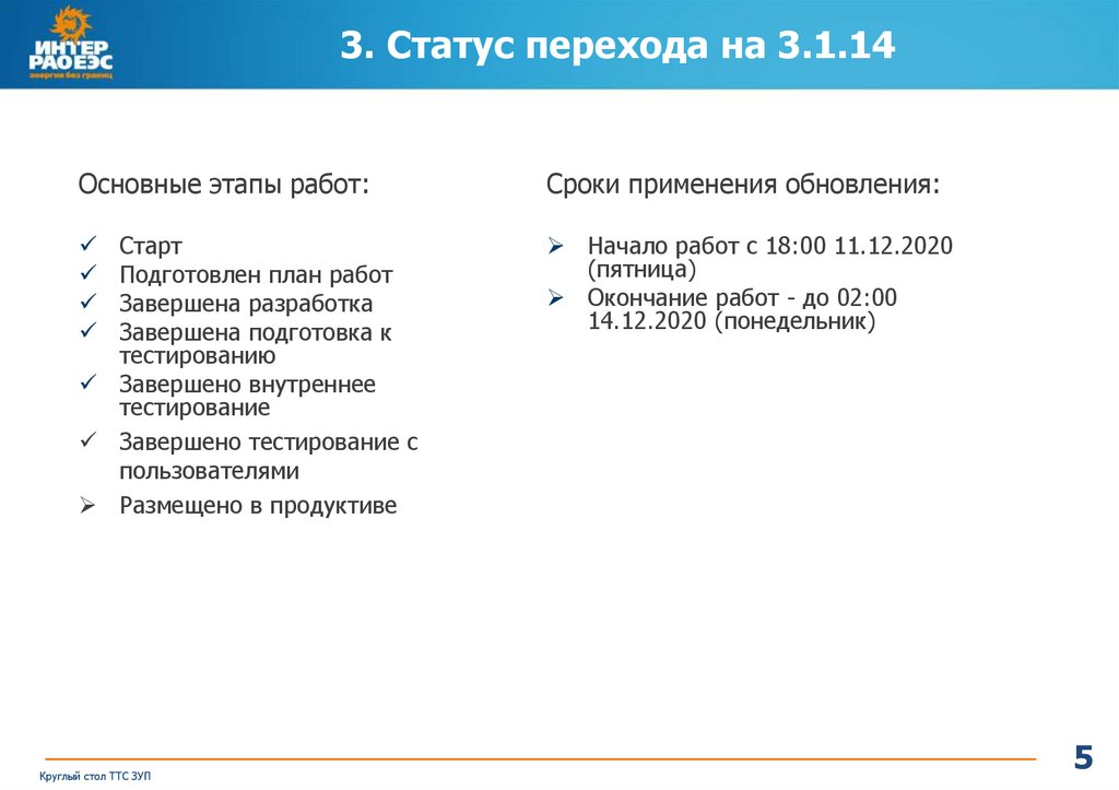 3. Статус перехода на 3.1.14Основные этапы работ: