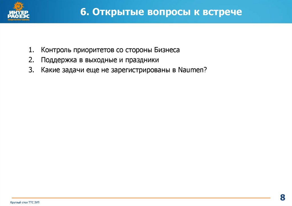 6. Открытые вопросы к встрече1. Контроль приоритетов со стороны Бизнеса