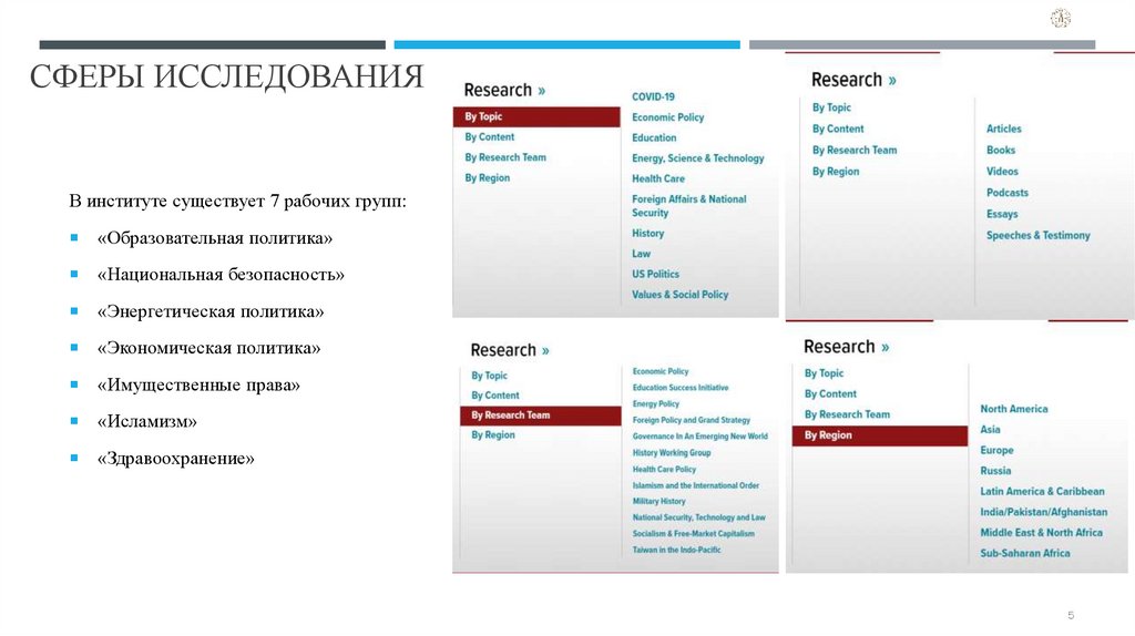 СФЕРЫ ИССЛЕДОВАНИЯВ институте существует 7 рабочих групп: