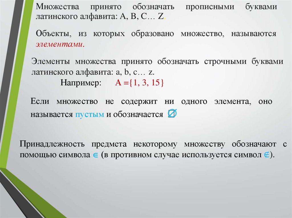 Элементы множества принято обозначать строчными буквами