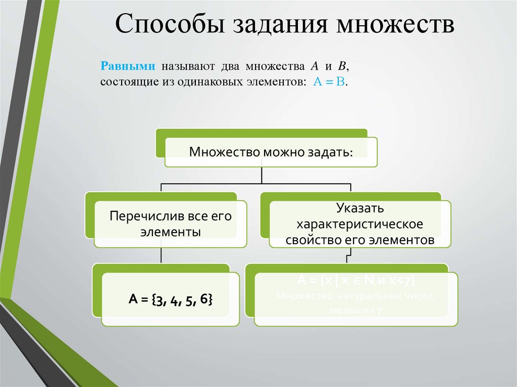 Способы задания множествРавными называют два множества A и B,