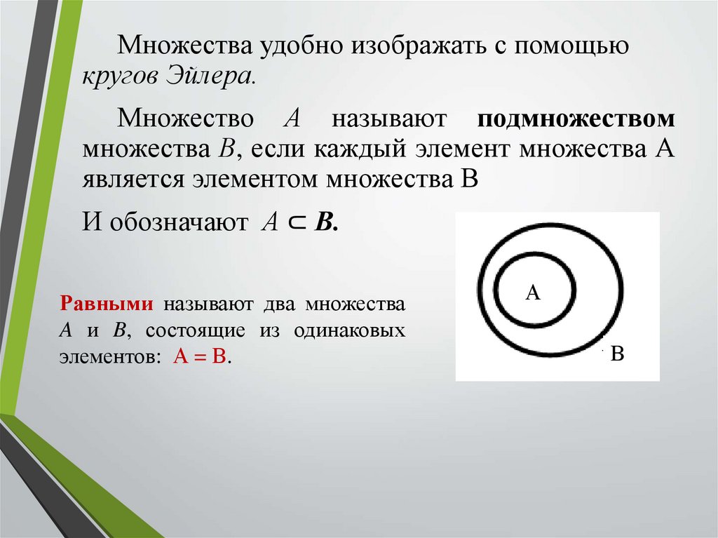 Множества удобно изображать с помощьюкругов Эйлера.