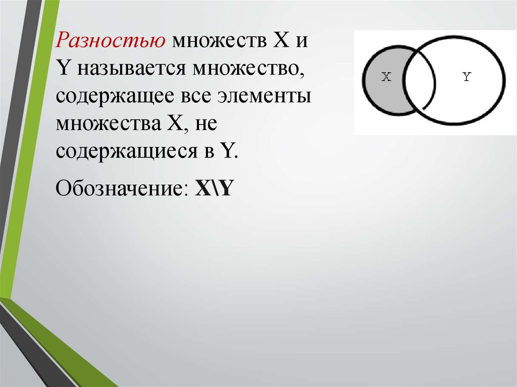 Разностью множеств X иY называется множество,