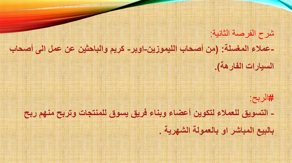 شرح الفرصة الثانية:عمالء المغسلة( :من أصحاب الليموزين-اوبر -كريم والباحثين عن عمل الى أصحابالسيارات الفارهة).