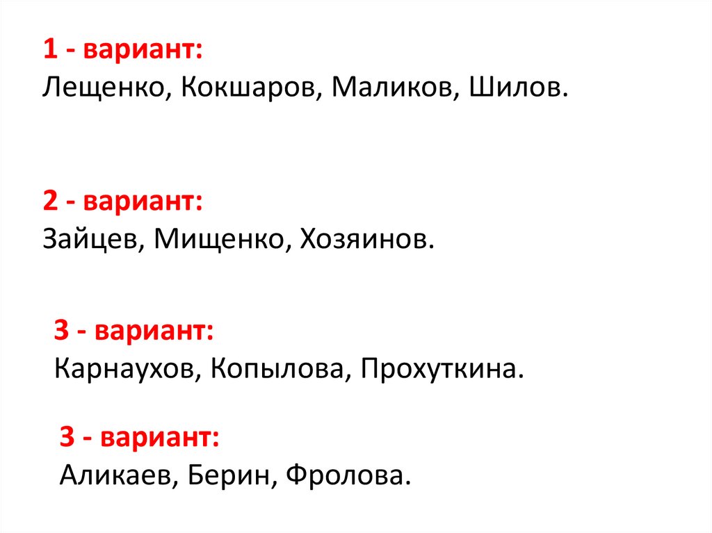 1 - вариант:Лещенко, Кокшаров, Маликов, Шилов.