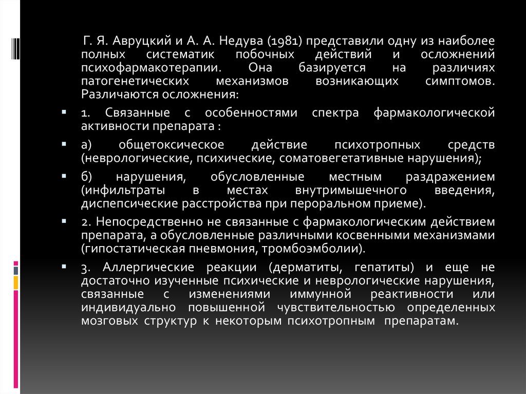 Г. Я. Авруцкий и А. А. Недува (1981) представили одну из наиболееполных систематик побочных действий и осложнений