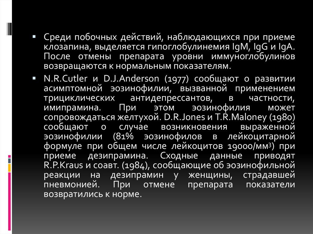 Среди побочных действий, наблюдающихся при приемеклозапина, выделяется гипоглобулинемия IgM, IgG и IgA.