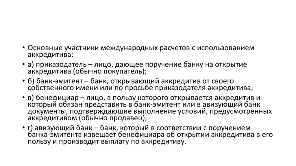 • б) банк-эмитент – банк, открывающий аккредитив от своего