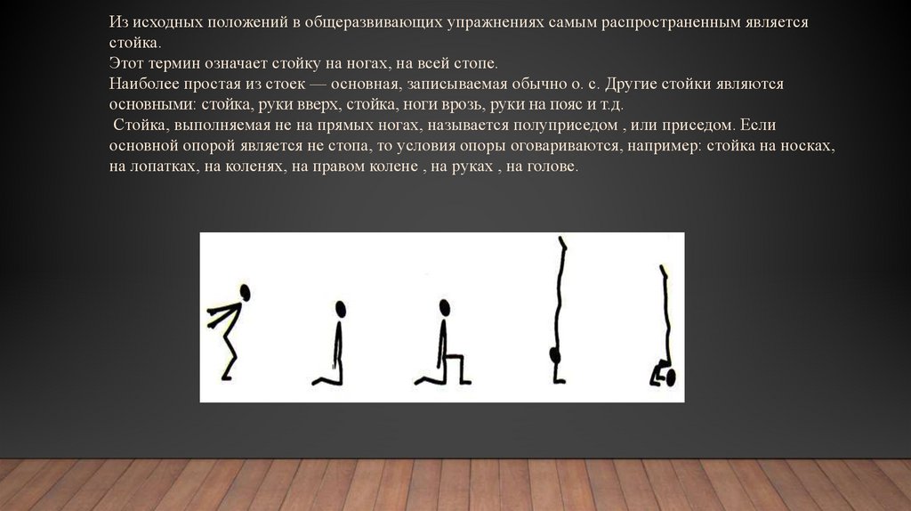 основными: стойка, руки вверх, стойка, ноги врозь, руки на пояс и т.д.