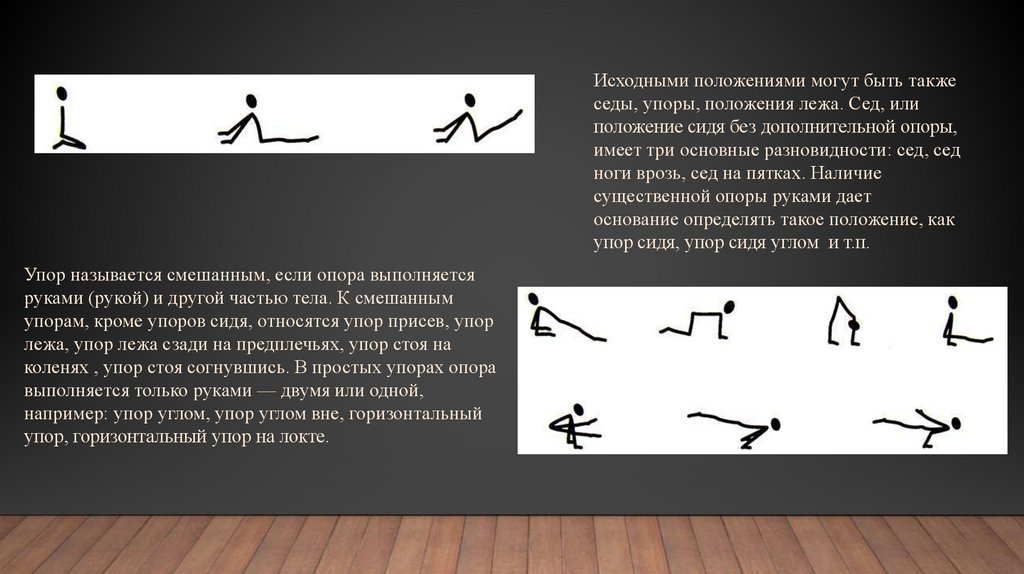 Исходными положениями могут быть такжеседы, упоры, положения лежа. Сед, или