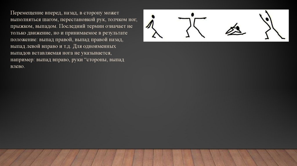 Перемещение вперед, назад, в сторону можетвыполняться шагом, перестановкой рук, толчком ног,