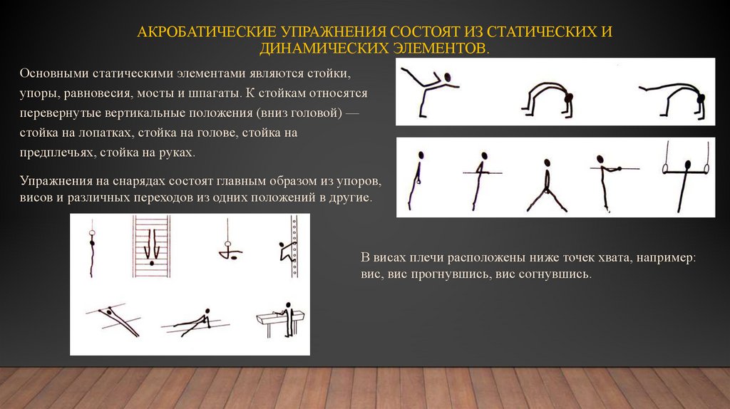 упоры, равновесия, мосты и шпагаты. К стойкам относятся
