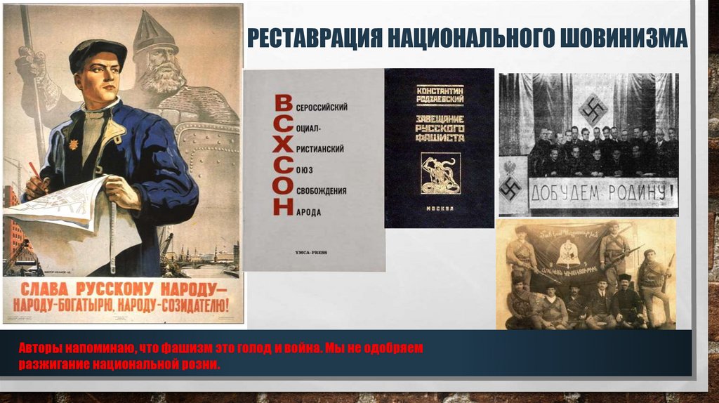 РЕСТАВРАЦИЯ НАЦИОНАЛЬНОГО ШОВИНИЗМААвторы напоминаю, что фашизм это голод и война. Мы не одобряем