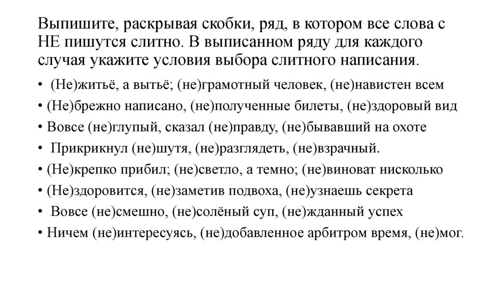 • (Не)брежно написано, (не)полученные билеты, (не)здоровый вид