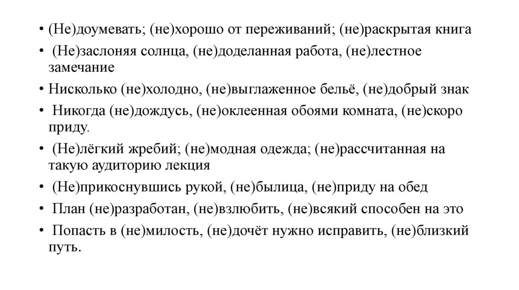 • (Не)доумевать; (не)хорошо от переживаний; (не)раскрытая книга• (Не)заслоняя солнца, (не)доделанная работа, (не)лестное
