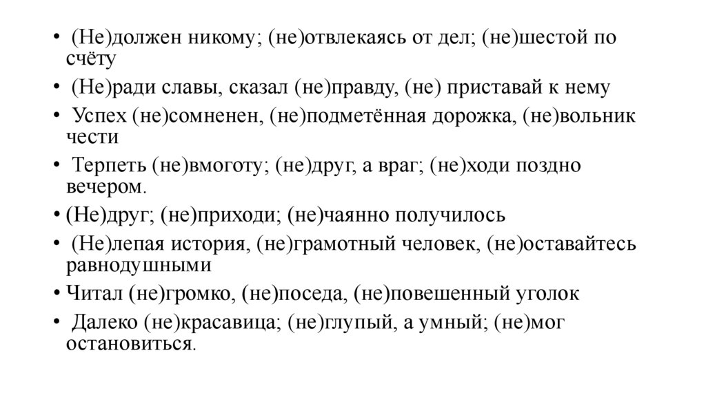 • (Не)должен никому; (не)отвлекаясь от дел; (не)шестой посчёту