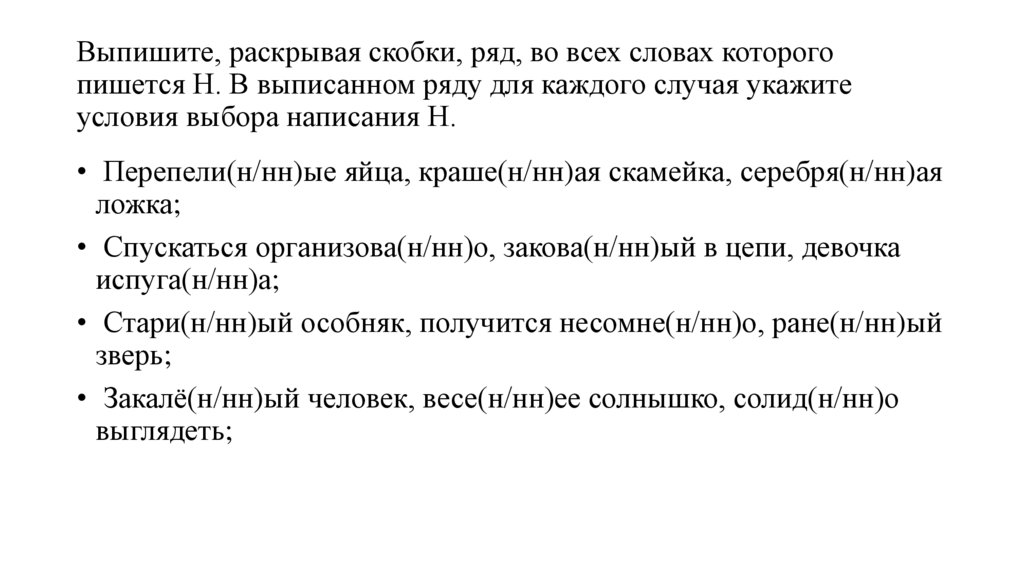 Выпишите, раскрывая скобки, ряд, во всех словах которогопишется Н. В выписанном ряду для каждого случая укажите