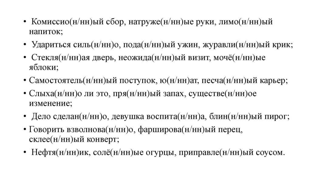• Комиссио(н/нн)ый сбор, натруже(н/нн)ые руки, лимо(н/нн)ыйнапиток;