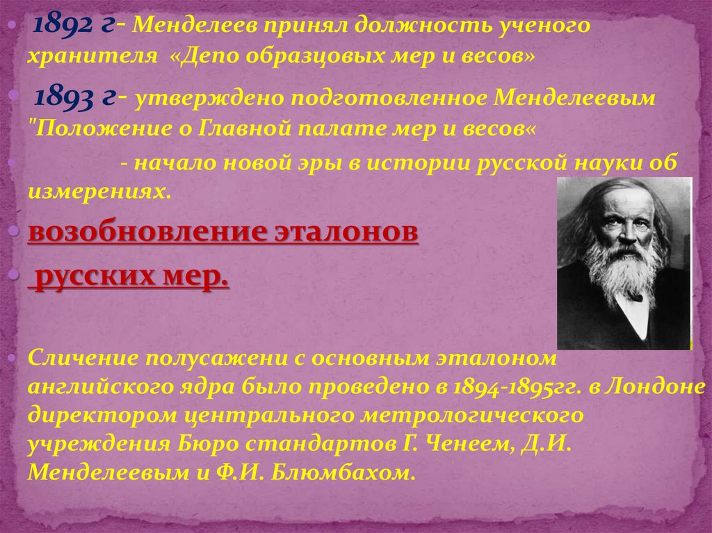 1892 г- Менделеев принял должность ученогохранителя «Депо образцовых мер и весов»