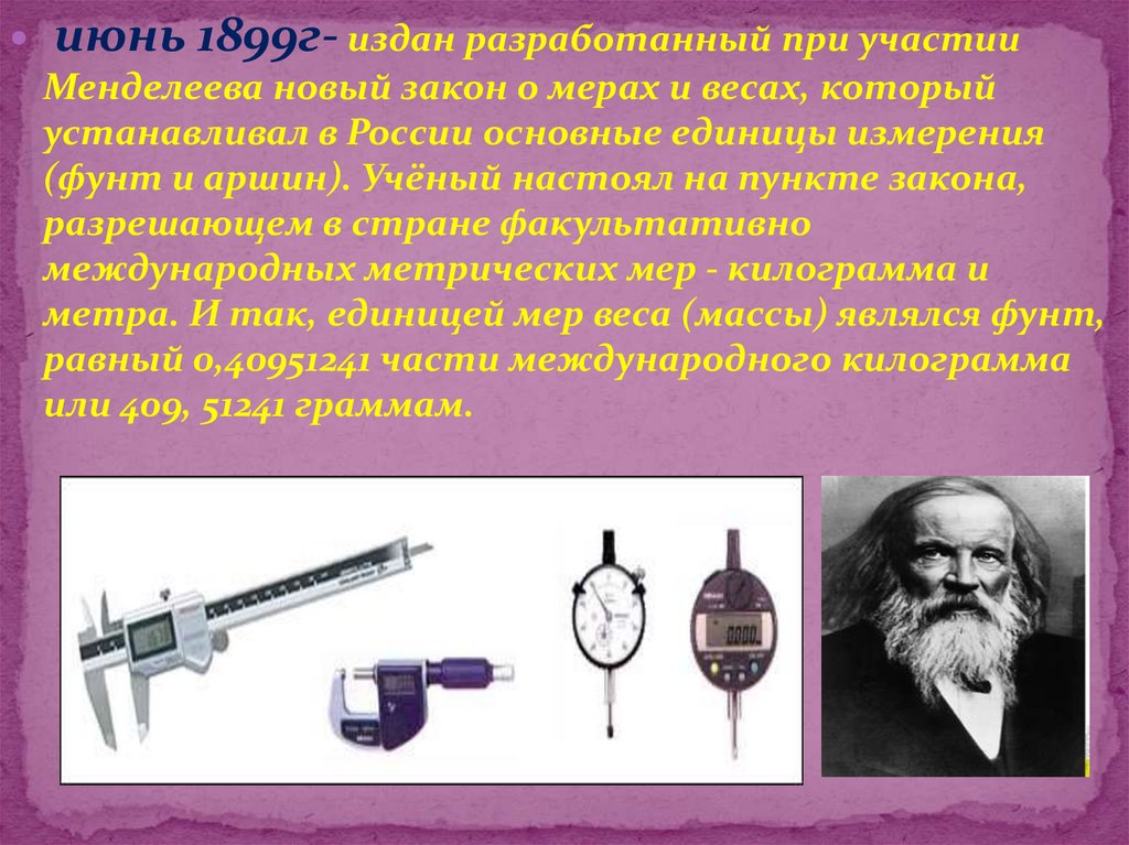 июнь 1899г- издан разработанный при участииМенделеева новый закон о мерах и весах, который