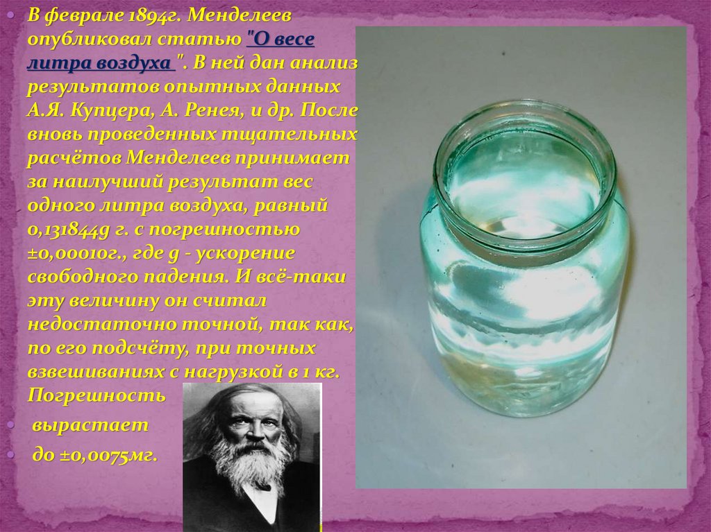 В феврале 1894г. Менделеевопубликовал статью "О весе