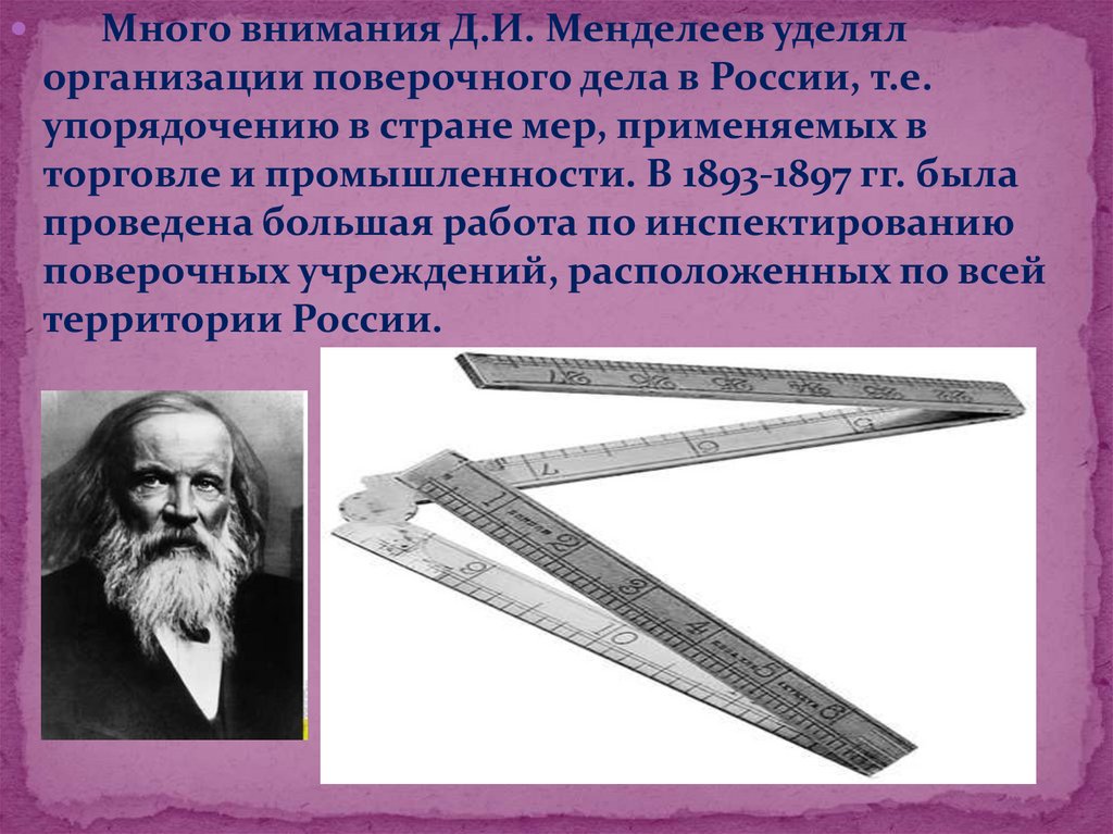 Много внимания Д.И. Менделеев уделялорганизации поверочного дела в России, т.е.