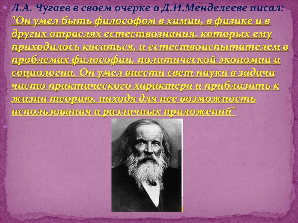 Л.А. Чугаев в своем очерке о Д.И.Менделееве писал:"Он умел быть философом в химии, в физике и в