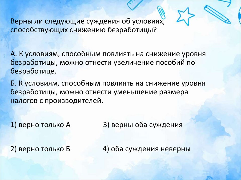 Верны ли следующие суждения об условиях,способствующих снижению безработицы?