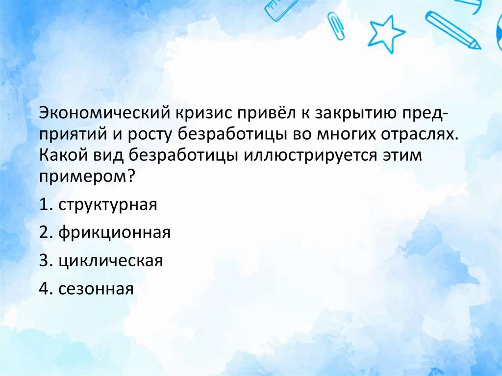 Экономический кризис привёл к закрытию предприятий и росту безработицы во многих отраслях.Какой вид безработицы иллюстрируется этим