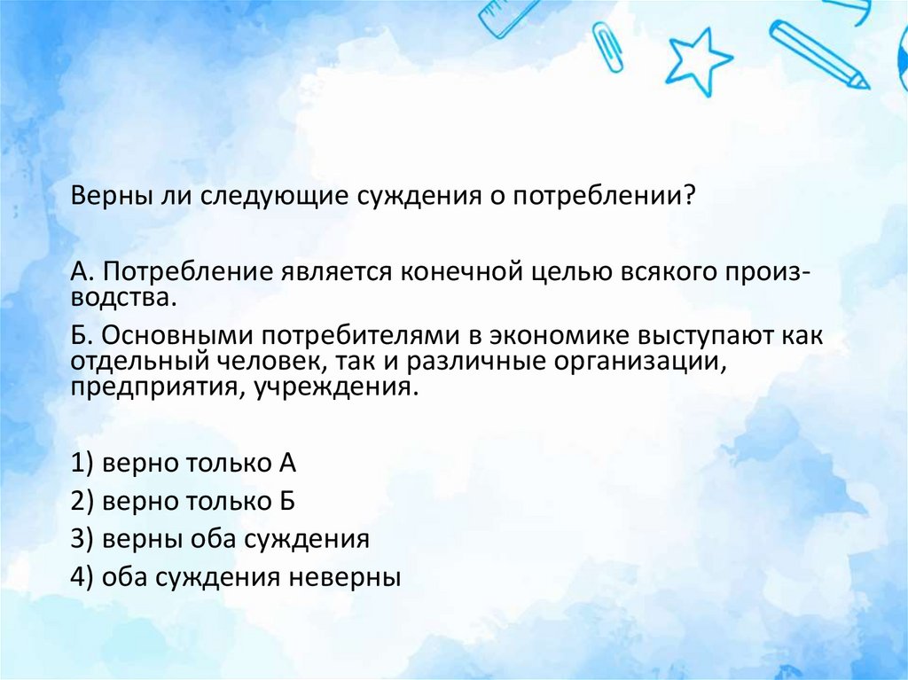 Верны ли следующие суждения о потреблении?А. Потребление является конечной целью всякого производства.