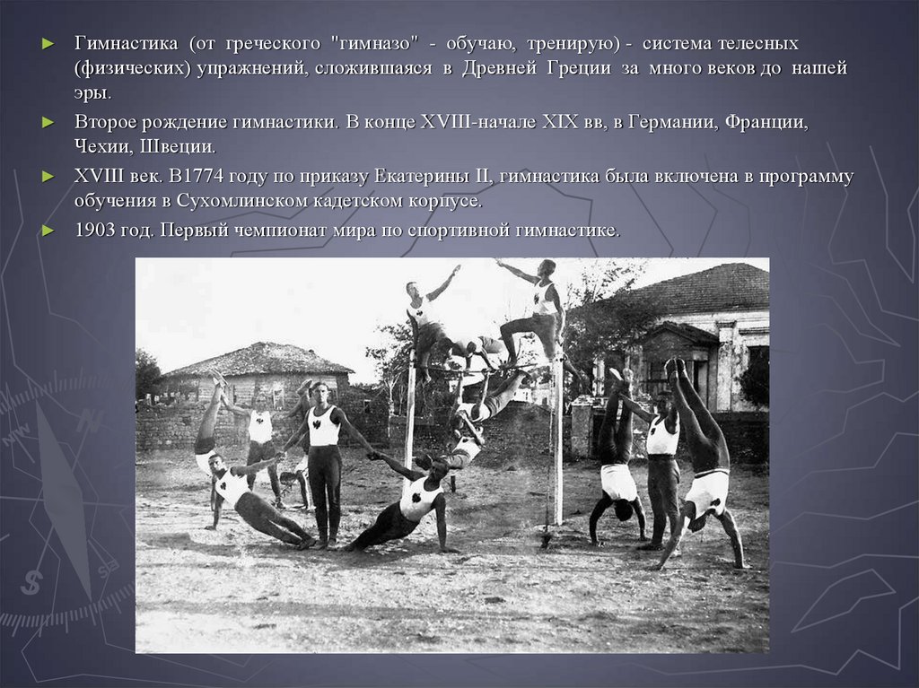 Гимнастика (от греческого "гимназо" - обучаю, тренирую) - система телесных(физических) упражнений, сложившаяся в Древней Греции за много веков до нашей