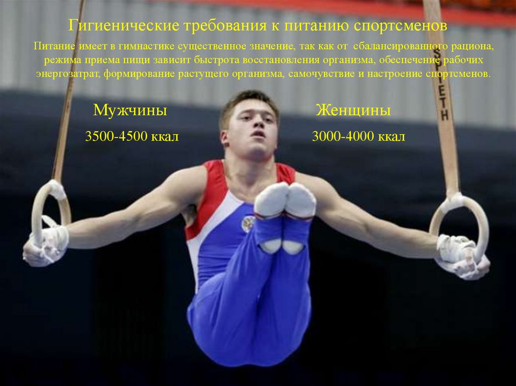 Гигиенические требования к питанию спортсменовПитание имеет в гимнастике существенное значение, так как от сбалансированного рациона,