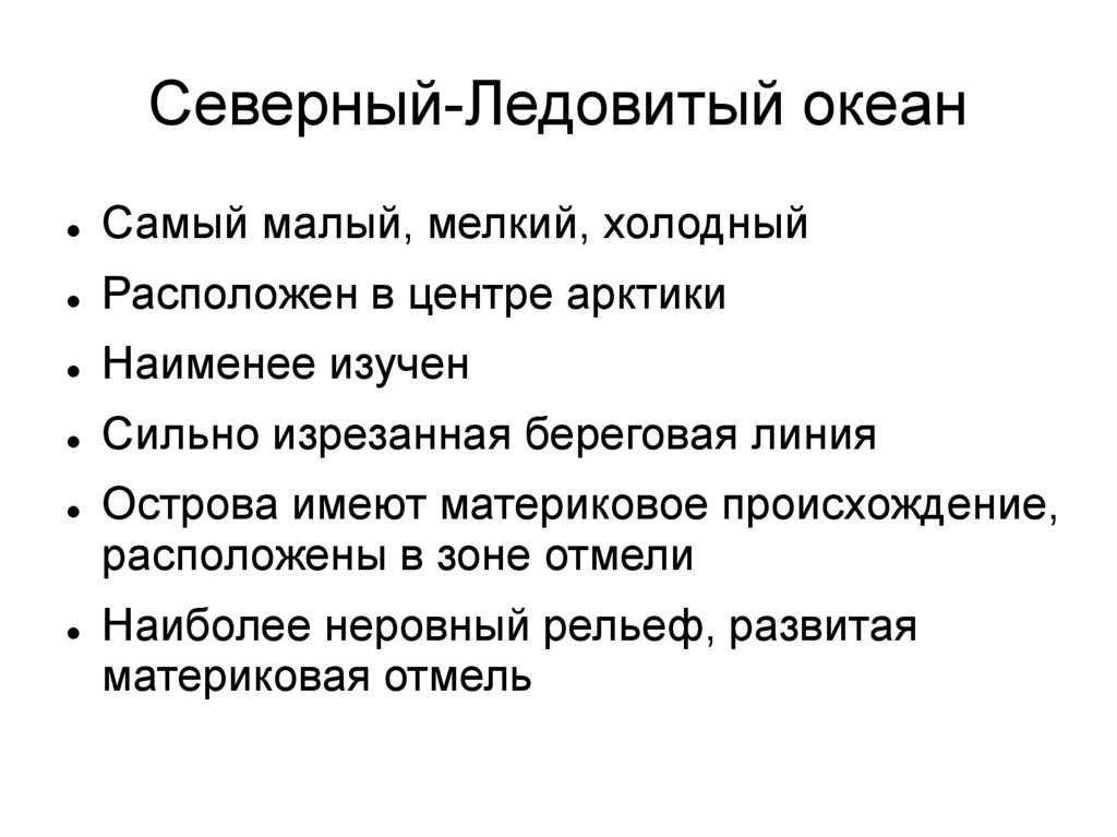 Северный-Ледовитый океанСамый малый, мелкий, холодный