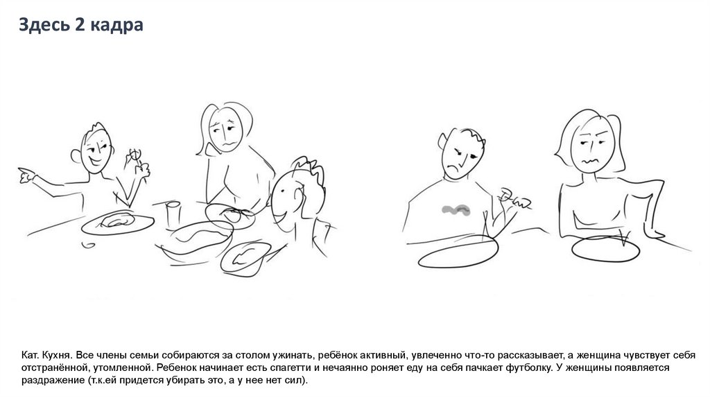 отстранённой, утомленной. Ребенок начинает есть спагетти и нечаянно роняет еду на себя пачкает футболку. У женщины появляется