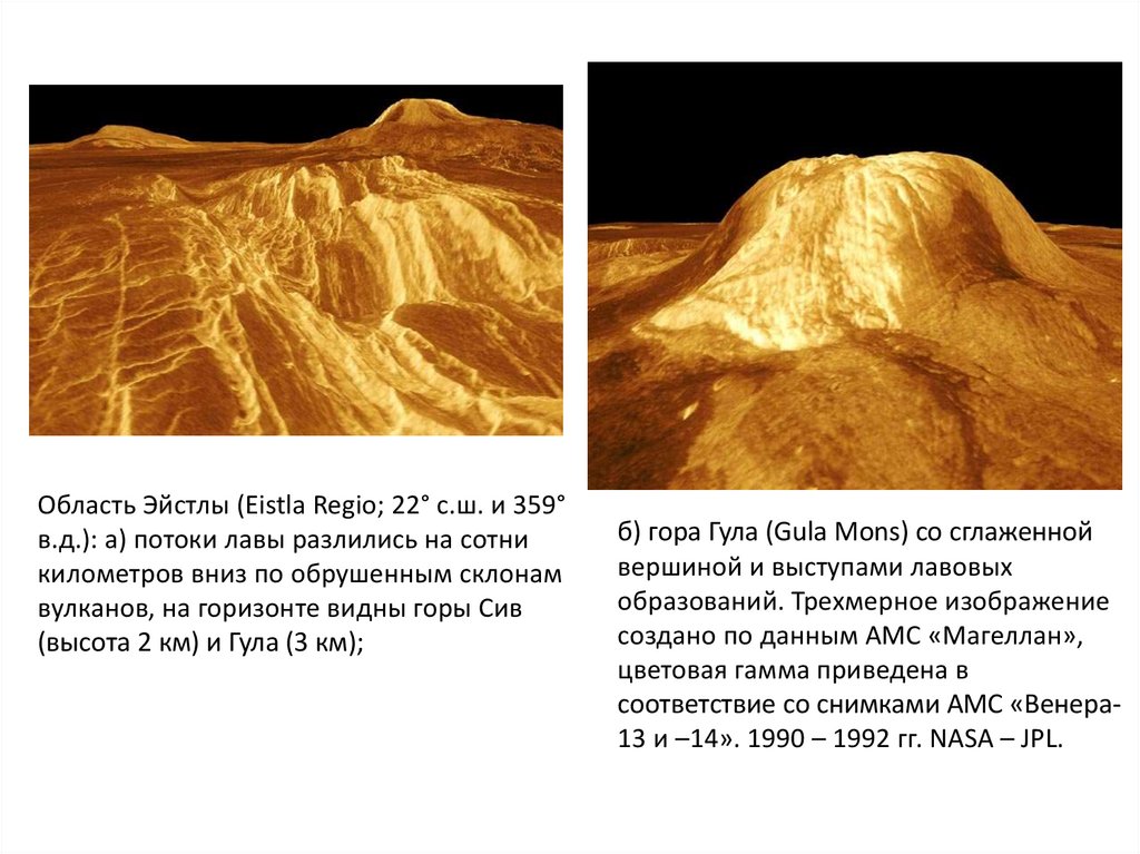 Область Эйстлы (Eistla Regio; 22° с.ш. и 359°в.д.): а) потоки лавы разлились на сотни