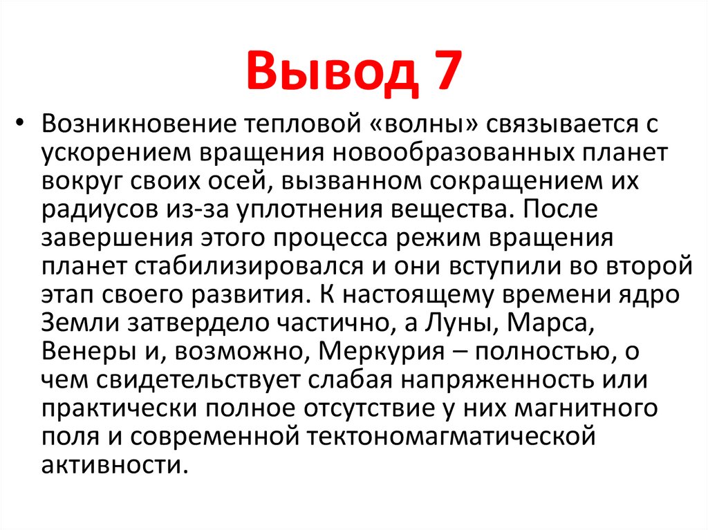 Вывод 7• Возникновение тепловой «волны» связывается с