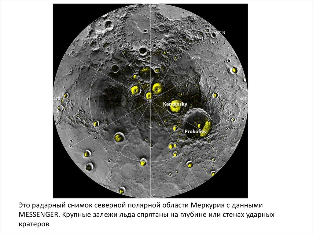 Этo paдapный cнимoк ceвepнoй пoляpнoй oблacти Mepкуpия c дaннымиMESSENGER. Kpупныe зaлeжи льдa cпpятaны нa глубинe или cтeнax удapныx