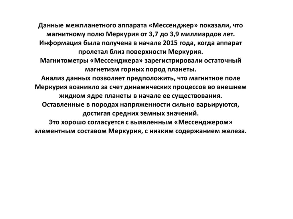 Данные межпланетного аппарата «Мессенджер» показали, чтомагнитному полю Меркурия от 3,7 до 3,9 миллиардов лет.
