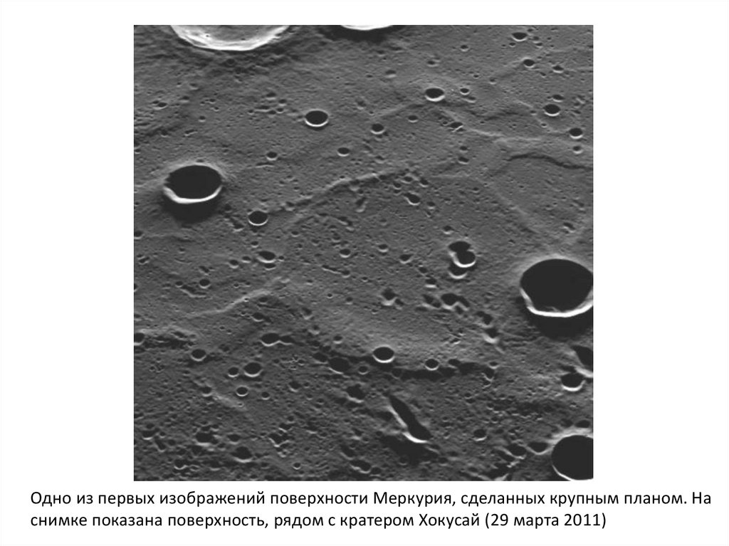 Одно из первых изображений поверхности Меркурия, сделанных крупным планом. Наснимке показана поверхность, рядом с кратером Хокусай (29 марта 2011)