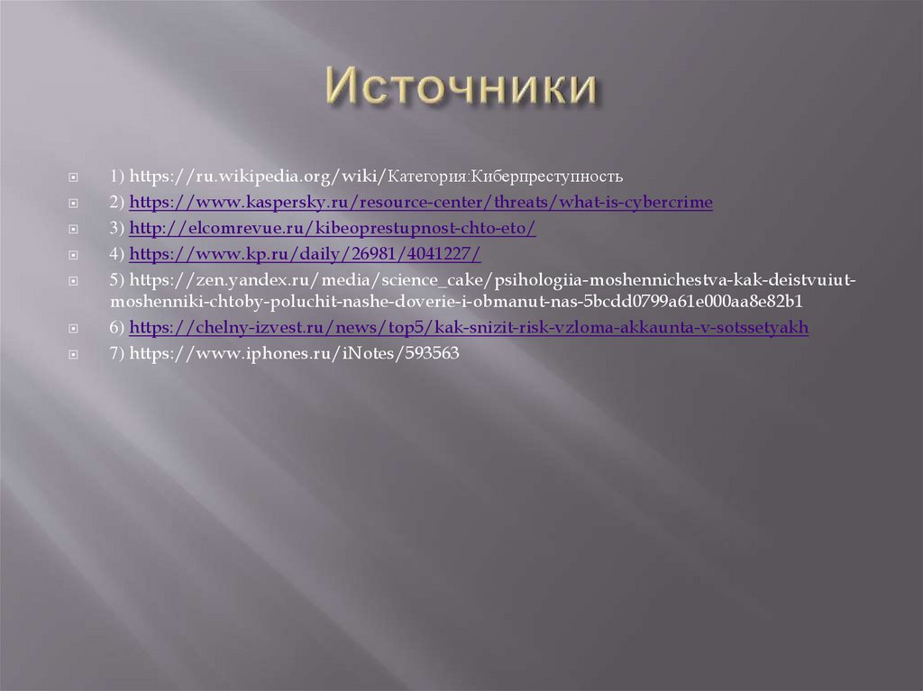 1) https://ru.wikipedia.org/wiki/Категория:Киберпреступность2) https://www.kaspersky.ru/resource-center/threats/what-is-cybercrime
