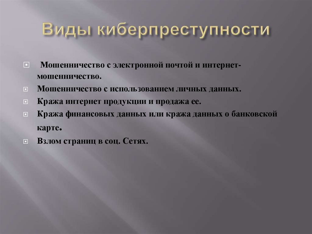 1.Рассказать что такое киберпреступность.2.Рассказать про виды киберпреступности.