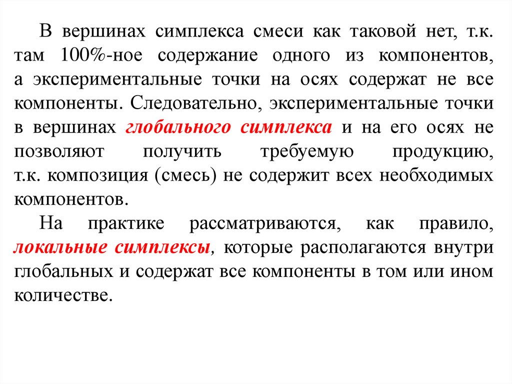 В вершинах симплекса смеси как таковой нет, т.к.там 100%-ное содержание одного из компонентов,
