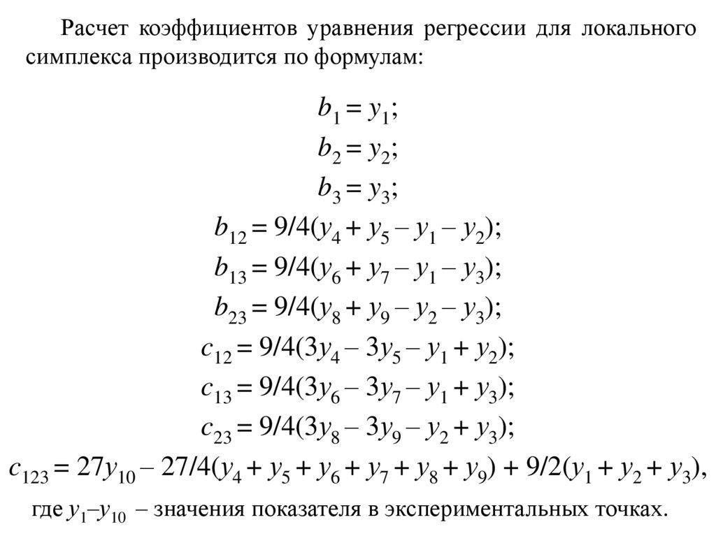 Расчет коэффициентов уравнения регрессии для локальногосимплекса производится по формулам:
