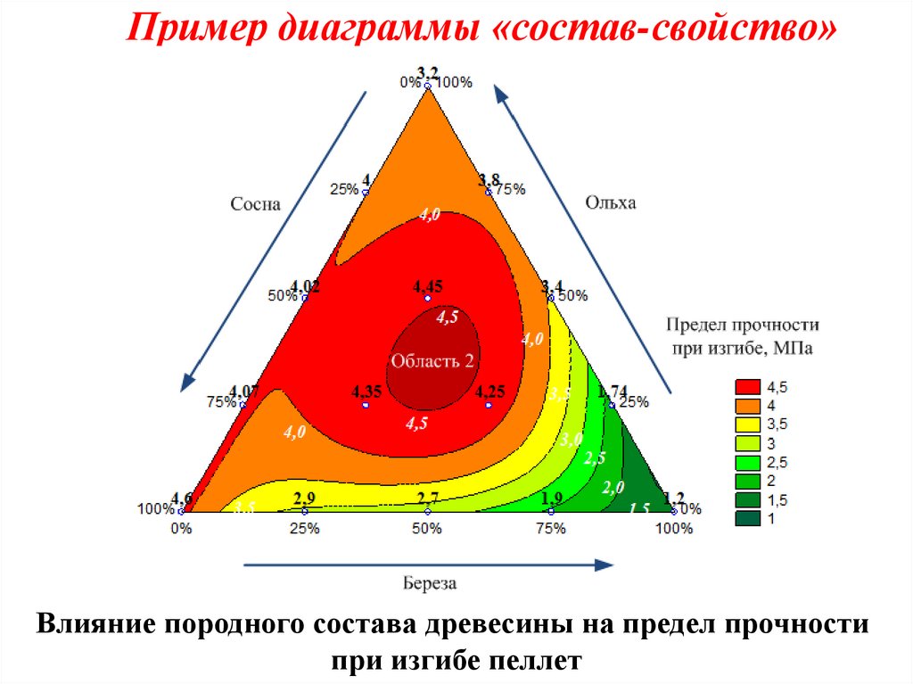 Пример диаграммы «состав-свойство»Влияние породного состава древесины на предел прочности