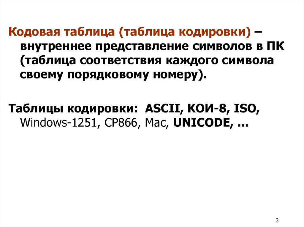 Кодовая таблица (таблица кодировки) –внутреннее представление символов в ПК