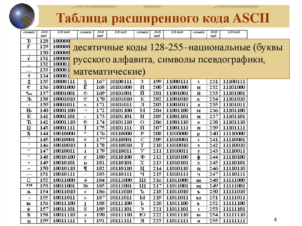 Таблица расширенного кода ASCIIдесятичные коды 128-255–национальные (буквы